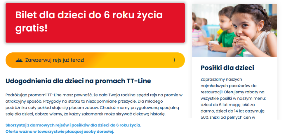 • TT-Line – dzieci do 6 roku życia mogą podróżować gratis, a młodsze dzieci mają również bezpłatne posiłki i udogodnienia onboard (zniżki również dla starszych dzieci).
